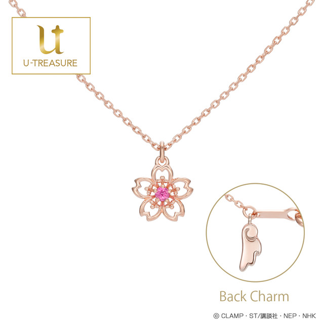このネックレスのデザインは、U-TREASUREとTokyo Otaku Modeによるファン参加型の商品開発企画「カードキャプターさくら新作ジュエリープロジェクト」から選ばれたもの。さくらモデルは、さくらの可愛らしさと優しさを桜の花でイメージし、繊細な透かし模様を施したデザイン。ネックレスの中央にはイメージカラーの宝石・ピンクサファイアが、チャームにはトレードマークの羽があしらわれた。