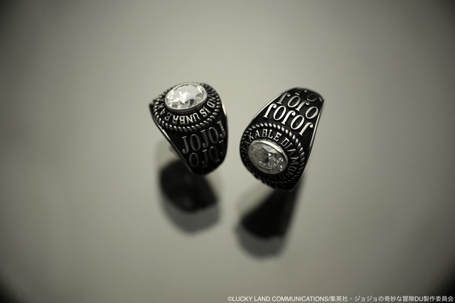 さらに第3部の主人公・空条承太郎が装着するダブルベルトをモチーフにした「JOJO空条承太郎ダブルベルトリング」の内側には、承太郎の学帽に描かれている「♂」と「♀」を組み合わせたマークと、左手の手のひらのアイコンが刻印。2つのリングを重ね合わせることでマークが現れる仕組みになっている。