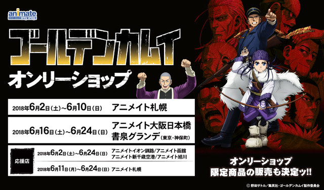 野田サトル原作によるアニメ「ゴールデンカムイ」のオンリーショップが、東京・書泉グランデ、北海道・アニメイト札幌店、大阪・アニメイト大阪日本橋店に6月にオープンする。