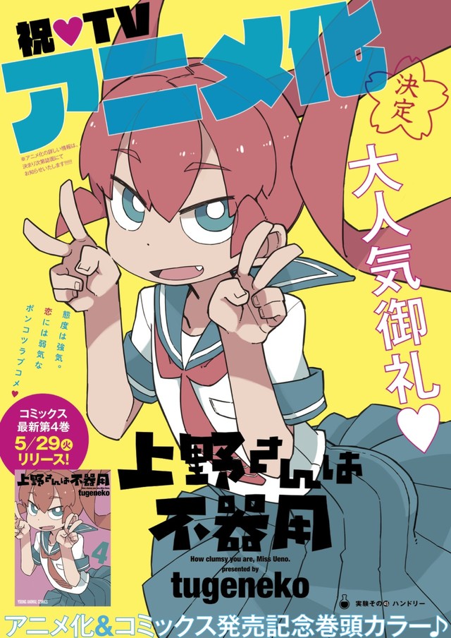 tugeneko「上野さんは不器用」のテレビアニメ化が決定。本日5月25日発売のヤングアニマル11号(白泉社)にて発表された。