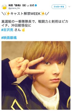 沖田は毒舌かつ腹黒でドSな内面を持つ、真選組の一番隊隊長。「銀魂2(仮)」の公式サイト、Twitter、Instagramでは、吉沢のコメントも公開されている。