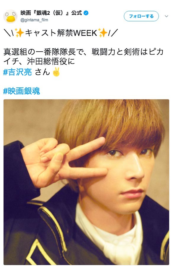 空知英秋原作による実写映画「銀魂2(仮)」に、前作より引き続き吉沢亮が沖田総悟役で出演することが発表された。