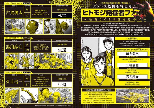 「粘菌人間ヒトモジ」は、強いストレスを感じると体が溶け、粘菌人間“ヒトモジ”になってしまう感染症が広まっている世界を描いた物語。新章では過去にいじめられた経験を持つ脚本家の女性を主人公に描かれていく。今号には新章の開始にあわせて、これまでの物語を振り返る作品紹介が掲載された。また次号には山岸凉子の読み切り「時計草」が登場する。