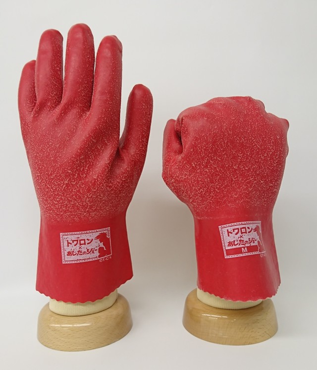 東和コーポレーションが同社のロングセラー製品“トワロン”の発売50周年を記念し、同じく今年連載開始50周年となる「あしたのジョー」とのコラボレーションを実現した本商品。手袋はジョーのボクシンググローブのように鮮やかな赤色の天然ゴム製で、手首の部分にはコラボレーションロゴがプリントされている。