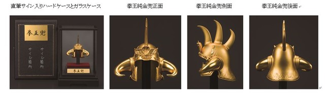 「“拳王”純金製兜」は、拳王・ラオウが作中でかぶっていた兜を1/4スケールで再現したもの。シリアルナンバー入り限定5個の販売で、価格は270万円になる。入れ物のハードケース正面には武論尊と原哲夫が直筆サインを入れる。「純銀製兜」はガラスケース入りで37万8000円、「ポリストーン製兜」は台座付きで2万6784円。