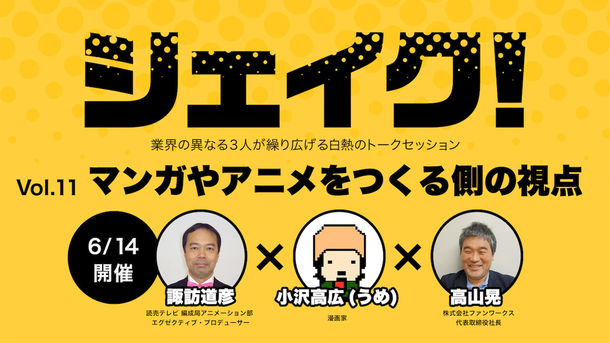 これはテレビ業界で活躍している人、そして異なる業界で活躍する人が計3名登場する「シェイク!」というトークセッション企画のひとつ。vol.11の今回は小沢とともに、アニメ「名探偵コナン」のプロデューサー・諏訪道彦、ファンワークスの代表取締役社長である高山晃が出演し、マンガやアニメなどのコンテンツ制作およびビジネスに携わっている視点からトークを繰り広げる。参加希望者は、PassMarketから申し込もう。