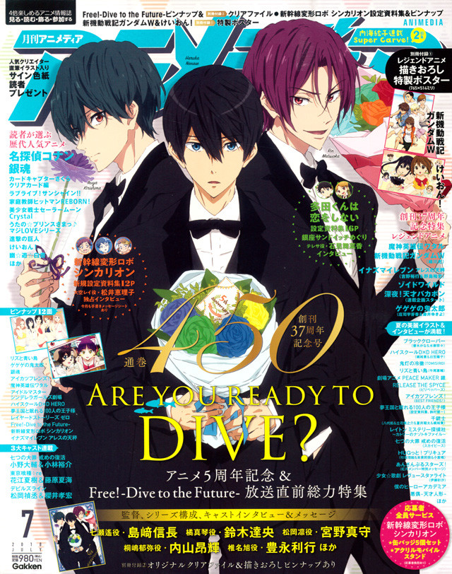 創刊37周年、通巻450号を記念した今号では「37 450(みんなようこそ)アニメディアカーニバルへ」と題した特集を展開し、さまざまなアニメ作品を紹介。今年で第1期放送から5周年を迎え、7月からは新シリーズ「Dive to the Future」がオンエアされる「Free!」のコーナーでは、主人公・七瀬遙役の島崎信長のインタビューに加え、河浪栄作監督、シリーズ構成の横谷昌宏、橘真琴役の鈴木達央、松岡凛役の宮野真守、桐嶋郁弥役の内山昂輝、椎名旭役の豊永利行からのメッセージも掲載された。