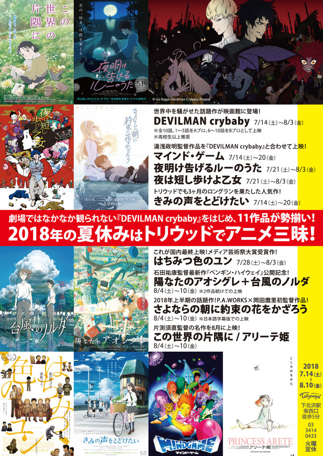 このたびの特集上映では青木俊直がキャラクター原案を担当した「きみの声をとどけたい」、湯浅政明が監督を務めた「マインド・ゲーム」「夜明け告げるルーのうた」「夜は短し歩けよ乙女」、さらに「DEVILMAN crybaby」もスクリーンにかけられる。また国内最終上映となるメディア芸術祭大賞受賞作「はちみつ色のユン」に加え、最新作「ペンギン・ハイウェイ」が8月17日より公開されることを記念し、石田祐康監督の過去作「陽なたのアオシグレ」「台風のノルダ」も上映。8月には片渕須直監督の「この世界の片隅に」「アリーテ姫」もラインナップされている。各作品の上映スケジュールなどは、下北沢トリウッドの公式サイトで確認を。