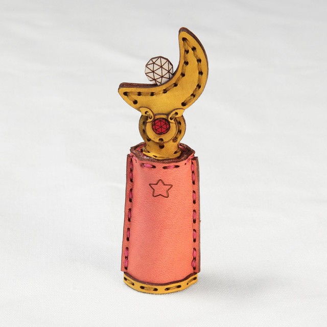 登場したのは、セーラー戦士たちのアイテムを革で表現した印鑑ケース2種とネックストラップ5種。印鑑ケースはムーンスティックとスパイラルハートムーンロッド、ネックストラップにはスターパワースティックのデザインが落とし込まれている。