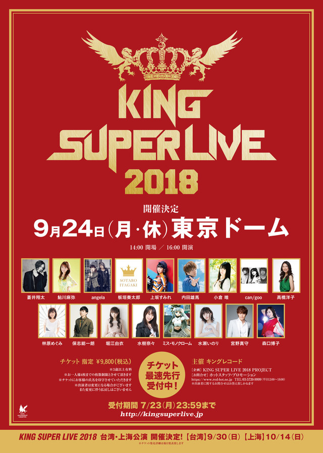 2015年、2017年に続き3度目の開催となる「KING SUPER LIVE」。東京公演には蒼井翔太、鮎川麻弥、angela、板垣奏太郎、上坂すみれ、内田雄馬、小倉唯、can/goo、高橋洋子、林原めぐみ、保志総一朗、堀江由衣、水樹奈々、ミス・モノクローム、水瀬いのり、宮野真守、森口博子の17アーティストが出演する。