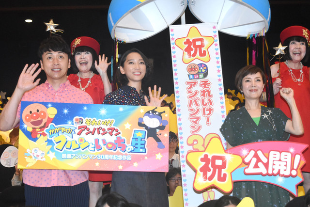6月30日に全国公開される本作は、劇場版「それいけ!アンパンマン」シリーズの30作目。アンパンマンの声を30年間担当してきた戸田は「おかげさまで30周年を迎えることができて感慨もひとしおです」としみじみ述べる。好奇心旺盛でちょっと不思議な子・クルンを演じた杏は、「映画館に来るのが初めての子は?」と客席に質問。会場の子供たちは「はーい!」と大きな返事をし、杏は「みんなのデビューと30周年の場に立ち会えてとってもうれしいです」と笑顔を浮かべる。ばいきんまんが作ったメカ・ゴロンゴロを演じた児嶋は「大島さん!」という呼びかけに「児嶋だよ!」とお約束のツッコミをし、「アンジャッシュも25周年なので、四捨五入すると30周年ということで一緒に祝っていただけたらと思います」と挨拶した。