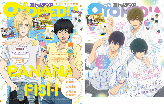 本日7月10日発売のオトメディア8月号(学研プラス)には、表紙と巻頭にテレビアニメ「BANANA FISH」が登場。W表紙はテレビアニメ「Free!-Dive to the Future-」が飾っている。