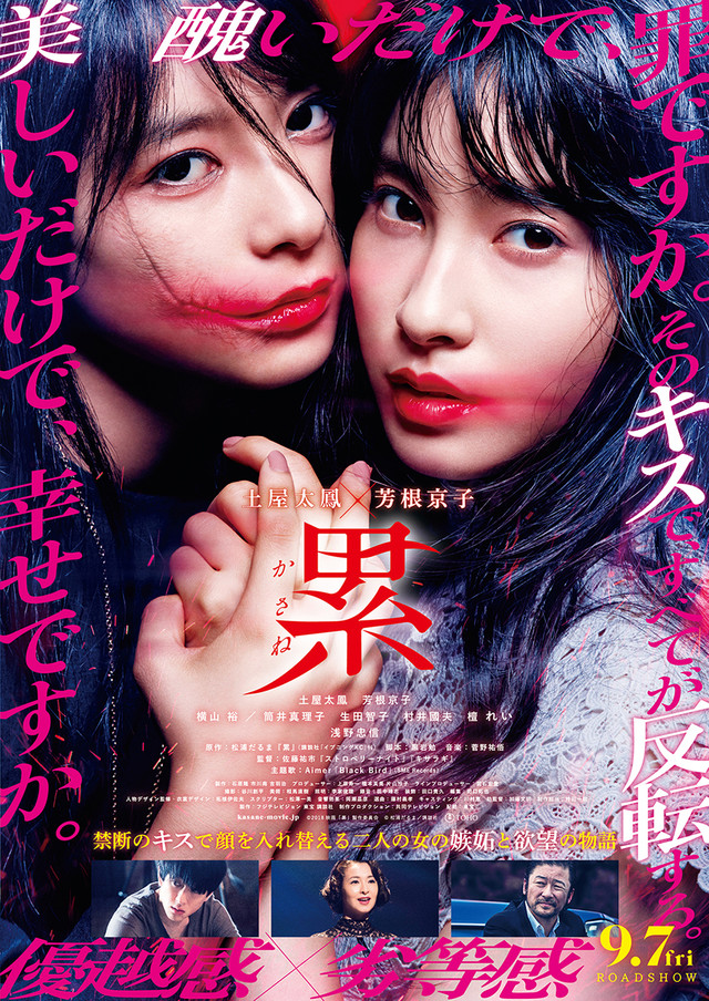 9月7日より全国公開される映画「累 ―かさね―」は、自身の醜い容姿にコンプレックスを抱きながら生きてきた累が、魔法の口紅と天性の演技の才能でのし上がっていく姿を描くサスペンス。キスをした相手と顔が入れ替わるという設定を踏まえ、映画では累とニナを土屋と芳根がそれぞれ演じ分ける。