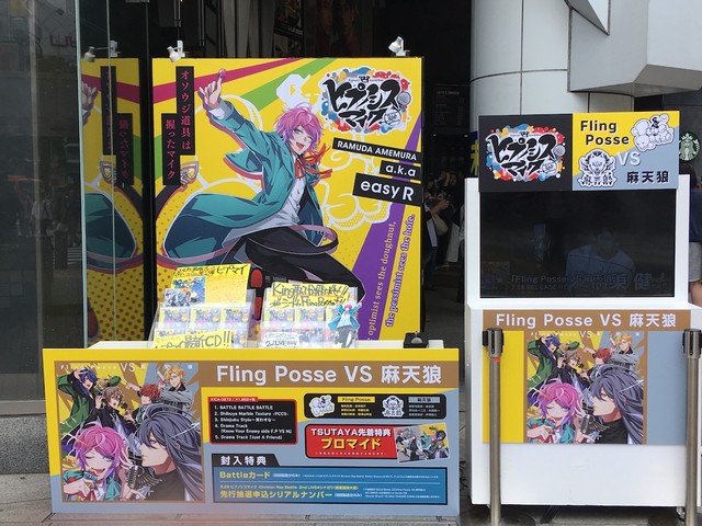 目下展開中のユーザー参加型企画「Battle Season」の“2nd Battle”として、シブヤ・ディビジョン「Fling Posse」とシンジュク・ディビジョン「麻天狼」によるバトル曲が収録される「Fling Posse VS 麻天狼」。イベントの開催は当日告知されたにもかかわらず、SHIBUYA TSUTAYAには多くのファンが駆けつける。1階店頭ではシブヤ・ディビジョンの飴村乱数がお気に入りの「チュッパチャプス」と、ファッションデザイナーとして活躍する彼の名刺がファンに配布された。
