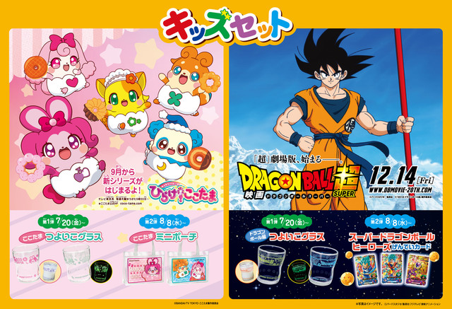 好きなドーナツやドリンクとグッズ1個を選んで購入できる「キッズセット」に、「ドラゴンボール超」と「キラキラハッピー★ ひらけ!ここたま」のオリジナルグッズが登場。7月20日からスタートする第1弾では、子供用グラスが各作品2種類ずつラインナップされた。8月8日からの第2弾では、アーケードゲーム「スーパードラゴンボールヒーローズ」で使用できるカード3種と、「ここたま ミニポーチ」2種が用意されている。