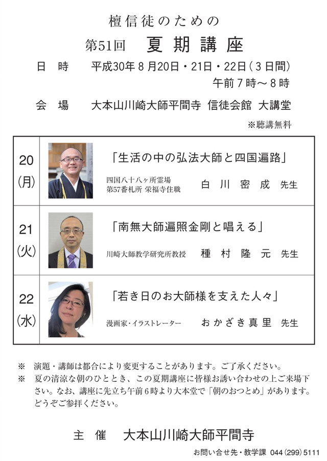 8月20日から22日にかけて行われる夏期講座にて、おかざきが行うのは「若き日のお大師様を支えた人々」と題した講座。おかざきは自身のTwitterで「『阿・吽』の絵を使って、調べた限りの『空海の周りにいる人たち』のお話をしようと思っています」と予告し、「『檀信徒のための』と書かれていますが、ご興味おありの方でしたらどなたでも大丈夫」と呼びかけた。