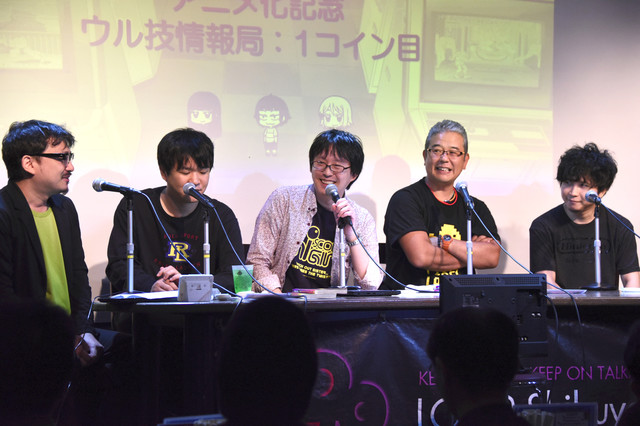 イベントには原作者の押切、アニメのプロデューサーである鶴岡信哉氏、アニメーション制作統括を務める松倉友二氏、オープニングテーマを歌うsora tob sakanaの音楽プロデューサー・照井順政氏が登壇。冒頭の自己紹介パートでは、それぞれが好きなゲームの名前を挙げるなど、本作らしい話題でイベントがスタートする。