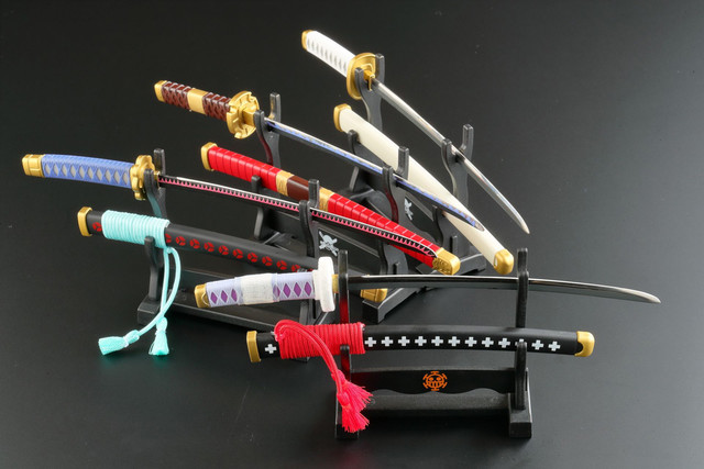 ペーパーナイフはゾロの愛刀「和道一文字」「三代鬼徹」「秋水」と、ローの愛刀「鬼哭」をモデルにした全4種。それぞれ刃紋や鍔の形状、鞘の形状まで再現されており、刃物の町と言われる岐阜県関市の職人によって1本ずつ丁寧に刃付けされた。掛け台付きなので、使用していないときも飾って楽しむこともできる。