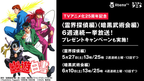 冨樫義博原作によるアニメ「幽☆遊☆白書」の一挙放送が、AbemaTVにて5月27日より6週連続で実施される。