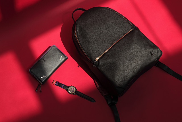 ラインナップされたのはバッグ、腕時計、長財布の3アイテム。バッグは大容量のリュックタイプで、フロントには黒の騎士団マークのプレート、ポケットのファスナー部分にはチェス駒をモチーフにした飾りがさりげなくあしらわれた。腕時計はチェス盤をイメージしたチェック柄の盤面に、チェス駒のシルエットをデザイン。カラーリングで、ゼロの服装を表現した長財布には、衣装の袖口にあしらわれている模様をイメージし、ゴールドパーツが使用されている。