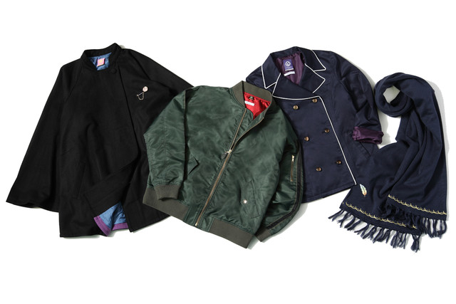 ラインナップされたのは歌仙兼定、御手杵、薬研藤四郎、太鼓鐘貞宗をイメージしたアウター4種。歌仙兼定モデルは、羽織りをモチーフにしたエレガントなブラックのコートとしてデザインされ、牡丹と飾り紐のストールピンが付属する。御手杵モデルは、彼の服装を模したカラーリングのゆったりとしたジャケット。薬研藤四郎モデルはネイビーのアウターで、ポケット部分には甲冑の紐をイメージした刺繍が施されている。太鼓鐘貞宗モデルも羽織りをデザインに落とし込んだ、ネイビーのストールだ。