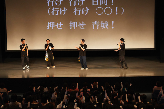 この日上映された「ハイパープロジェクション演劇『ハイキュー!!』」では、中学生だった日向が烏野高校へと進学し、青葉城西高校との練習試合を経て、西谷夕や東峰旭が烏野高校排球部へと復帰する原作序盤のエピソードを展開。得点時の歓声やジャンプサーブでの掛け声、ミスした際の「ドンマイ!」の一言など、観客は随所でバレーボールらしい応援を行う。壇上で鑑賞していたキャスト4人は、序盤のキャラクター紹介シーンやエンディングの挨拶の場面で上映中の映像と同様の動きを取り会場を沸かせた。