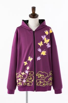 パーカーはジャージ素材を使用しており、高杉が着用している着物をイメージしたカラーリング。着物にあしらわれているのと同様に、蝶のイラストもちりばめられた。サイズはフリーのみで、価格は8640円。ACOSの公式サイトでは目下予約を受け付けている。