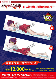 カバーのサイズは縦約160cm×横約50cm。イラストはねこ娘が添い寝をするというシチュエーションで描き下ろされており、表裏で異なる絵柄がプリントされている。価格は1万2960円。なおホビーストックのWebショップでは、抱き枕カバーの裏面イラストを使用したアクリルフィギュア付きの限定版も販売する。こちらの価格は1万3500円。