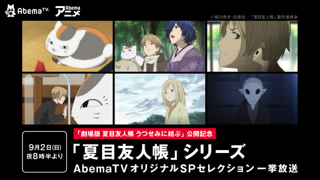 これは「劇場版 夏目友人帳 ~うつせみに結ぶ~」が、9月29日に公開されることを記念したもの。このたびの放送では、第1期の第1話「猫と友人帳」をはじめ、アニメの第1期から第6期より全13話のエピソードが選ばれた。また今回セレクトされたエピソードは、放送後から1カ月間Abemaビデオにて無料で視聴することができる。