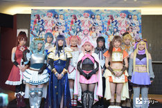 「舞台『マギアレコード 魔法少女まどか☆マギカ外伝』」会見の様子。前列左から二葉さな役の潮紗理菜、七海やちよ役の佐々木美玲、環いろは役の柿崎芽実、由比鶴乃役の富田鈴花、深月フェリシア役の渡邉美穂。後列左から佐倉杏子役の齊藤京子、美樹さやか役の金村美玖、鹿目まどか役の丹生明里、暁美ほむら役の河田陽菜、巴マミ役の加藤史帆。