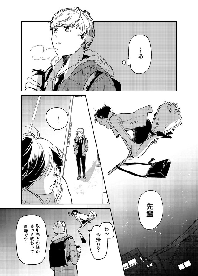 pixivで活動していた餅田のデビュー作となる「魔女先輩日報」の主人公は、魔女であることを周囲に知られつつ、普通の会社で地味に働いている女の子。そんな“魔女先輩”と後輩男子のやり取りを描くショートストーリーだ。第1話では同僚から仕事を押し付けられ、帰宅が遅くなった魔女先輩が帰り道に後輩と出会う。モノクロ作品だが、魔法を使う場面のみ一部がカラーになる演出にも注目だ。本作は第2・第4木曜日に更新される。
