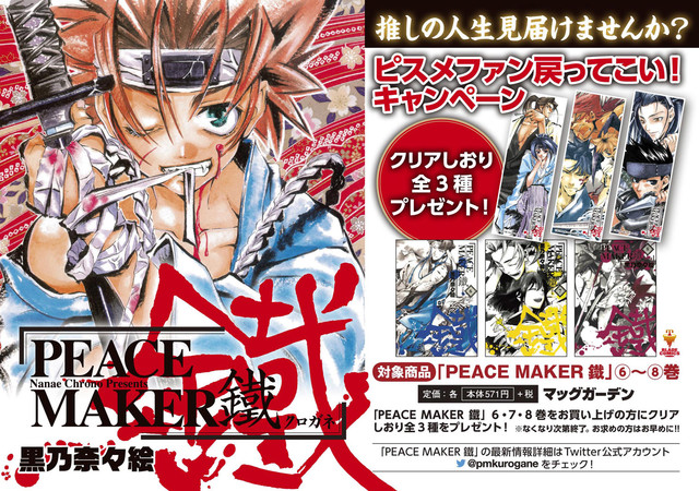 黒乃奈々絵「PEACE MAKER 鐵」の単行本を対象とした「推しの人生見届けませんか?ピスメファン戻ってこい!キャンペーン」が、全国の一部書店にて開催されている。