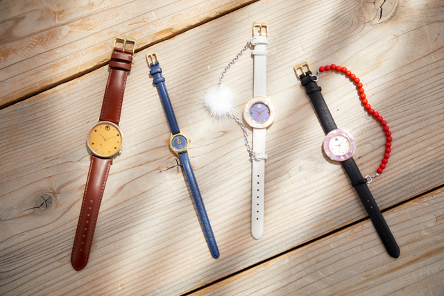 ラインナップされたのは山伏国広、にっかり青江、今剣、岩融をイメージした腕時計4種。山伏国広モデルはインデックスに胸元の飾りをイメージし、12時の位置に紋を、6時の位置に髪色モチーフのストーンをあしらい、にっかり青江モデルは細めのベルトと小振りなケースが印象的な華奢なデザインに仕上げられた。また今剣モデルは瞳をイメージしたストーンやファーのチャームでかわいらしさが表現され、今剣とお揃いのデザインが採用された岩融モデルは、オレンジビーズのチャームで大人っぽく彩られた。