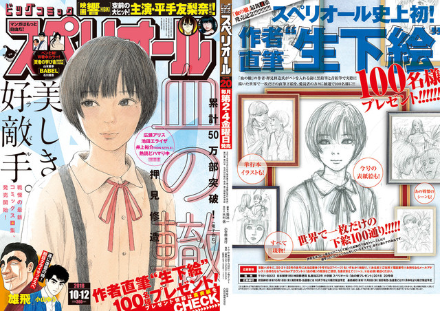 本日9月28日発売のビッグコミックスペリオール20号(小学館)では、押見修造「血の轍」が表紙と巻頭カラーに登場。誌面では押見直筆による生下絵のプレゼントキャンペーンが実施されている。