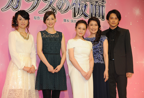 「ガラスの仮面」製作発表の様子。左から東風万智子、マイコ、貫地谷しほり、一路真輝、小西遼生。