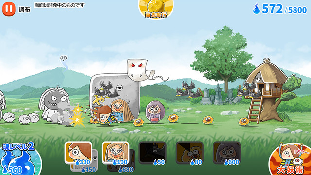 「ゆる~いゲゲゲの鬼太郎 妖怪ドタバタ大戦争」はポノスとディー・エヌ・エーによって共同開発された、横スクロールタイプのタワーディフェンスバトルゲーム。ポノスが配信するアプリゲーム「にゃんこ大戦争」と同様のシステムを基本とし、魂を消費してキャラクターを召喚、敵の陣地を攻撃する。キャラクターは10体まで編成できるほか、「百鬼夜行モード」を使用すると、大量の妖怪が出現して敵を押し返す。