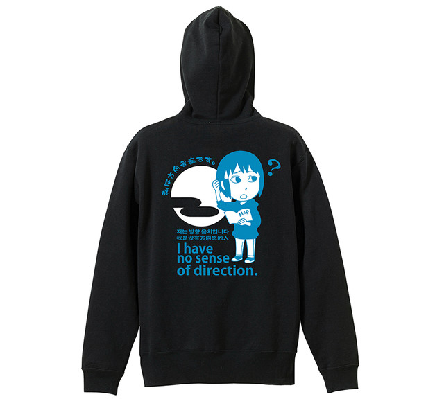 この度ラインナップされたのは、「方向音痴フルジップパーカー」「ハンバーガーマニア長袖Tシャツ」の2種類。「方向音痴フルジップパーカー」は発売中の「方向音痴Tシャツ」と同じく、地図を片手に迷う女子のイラストがデザインされた。また「ハンバーガーマニア長袖Tシャツ」は、ハンバーガーを食べる少女をプリントしたアイテムで、ネイビーとデイジーの2色が用意されている。