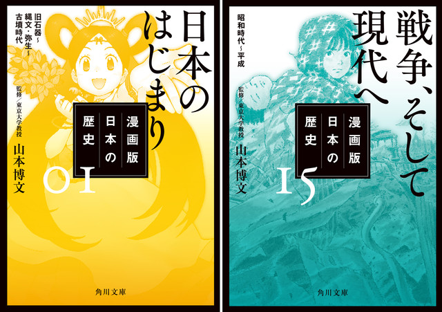 「漫画版 日本の歴史」は、400万部を突破するベストセラーとなった角川まんが学習シリーズ「日本の歴史」を文庫化したもの。吉崎観音小畑健、近藤勝也(スタジオジブリ)らがカバーイラストを手がけており、本文のマンガも現代的な画風で描かれている。各巻には里中満智子や、小説家、映画監督など各界の著名人による解説文も収録。さらに文庫版ではオリジナル企画として、監修を務める山本博文教授による書き下ろしコラム「はみだし講義」が各章末に収められている。10月には1巻、2巻、3巻、8巻、15巻、11月には4巻、5巻、6巻、7巻、9巻、12月には10巻、11巻、12巻、13巻、14巻がそれぞれ発売予定だ。