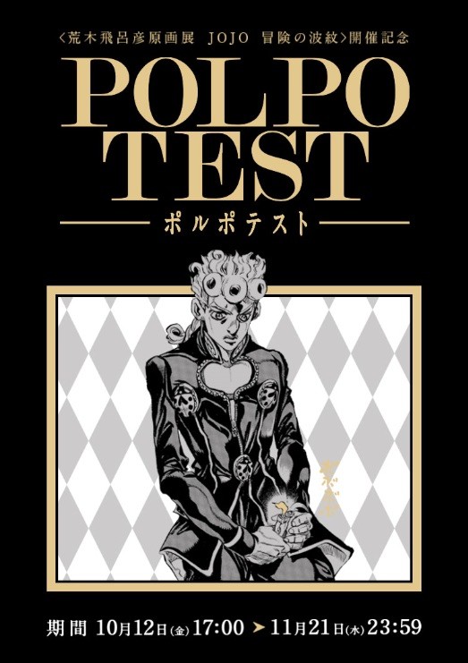 荒木飛呂彦「ジョジョの奇妙な冒険」の展覧会「荒木飛呂彦原画展 JOJO 冒険の波紋」大阪会場のチケットが明日10月13日10時に発売されることに合わせ、「ポルポテスト」と銘打ったスマートフォン専用ゲームが公開された。