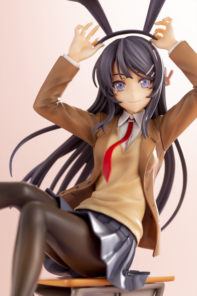 桜島麻衣は主人公の梓川咲太と同じ学校に通う3年生で、活動休止中の国民的人気タレントというキャラクター。そんな彼女が学校の机に腰掛け、ウサ耳を持ちながらいたずらっぽく微笑む姿が立体化された。また脚の黒ストッキング部分は、肌の透け具合もこだわり抜かれている。価格は1万1880円。コトブキヤオンラインショップで購入すると、特典として「表情替えパーツ」がプレゼントされる。