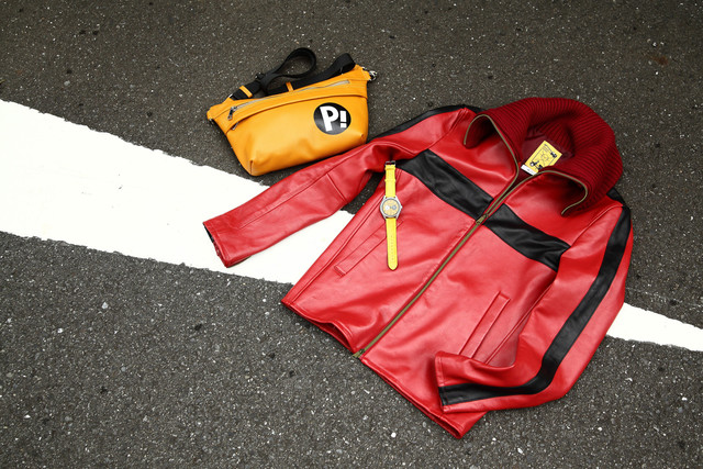 ラインナップされたのはブルゾン、バッグ、腕時計の3アイテム。ブルゾンはハルハ・ラハルが着ている赤いブルゾンをイメージした、本格的な羊革製。イタリアンイエローのバッグと腕時計には、愛車・ベスパのマークがあしらわれている。