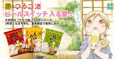 2015年より夏季限定で実施されている本コラボ企画。3年目となる今年のパッケージには「ぷしゅわ~」「ぷしゅりん♪」とビールを楽しむワカコのイラストが、例年よりも大きめにデザインされている。味のラインナップは「えび黒こしょう」「えびカリ」「塩わさび」の全3種類。個包装が5パック入ったビッグサイズや、3種類の味を詰め合わせたアソートタイプも用意された。ビッグサイズのパッケージではオリジナルの「ワカコ酒」4コマが楽しめるほか、個包装にもそれぞれワカコのイラストがあしらわれている。