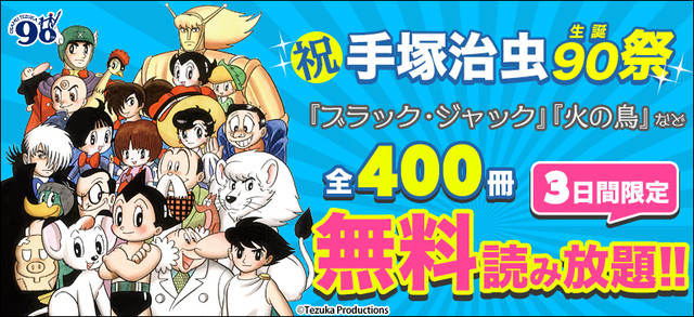 手塚治虫作品の計400冊が、本日11月2日から4日までの3日間限定で、電子書店のeBookJapanとアプリ・ebookjapanにて無料公開されている。