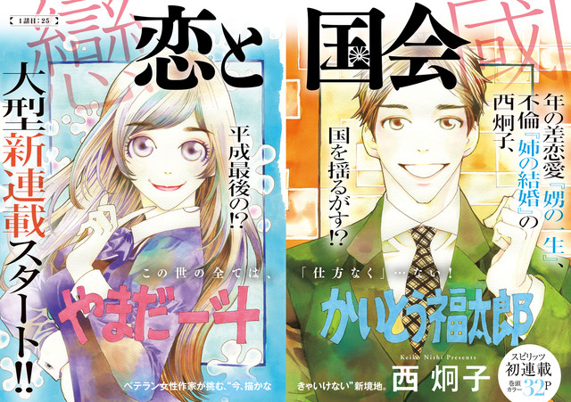 「恋と国会」は、政治家の一人息子・海藤福太郎が主人公。父に後を託され、「仕方がない」と諦めながらも政界へと足を踏み入れた福太郎は、そこで生まれも素質も資金力もまったく違う1人の女性に出会う。「娚の一生」で年の差恋愛、「姉の結婚」で不倫を描いた西が、初連載となるスピリッツで恋愛と政治を描いていく。