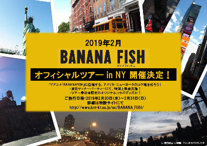 また市内観光のバス車内では、内田雄馬演じるアッシュと野島健児演じる英二による「オリジナルボイス」が登場。さらに貸切ディナーパーティーでは「BANANA FISH」最終回の特別上映会が行われるほか、ツアー参加者にはオリジナルコラボグッズも用意される。旅行期間は2019年2月20日から24日までの3泊5日で、旅行代金は1人26万4000円。申し込み期限は12月14日17時となる。