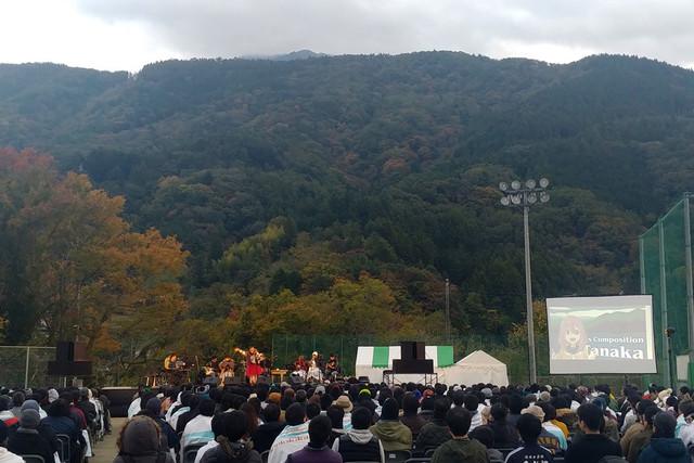 「ゆるキャン△」はキャンプ場ごとにテーマ曲が作られており、音楽祭ではそのほかの劇伴を交えながら、作品で主人公たちが巡った順に演奏されていく。9人編成での演奏にはマンドリンやティンホイッスル、バンジョー、さらにキャンプ場で使うような鍋やフライパンまで使用され、ファンの耳を楽しませた。開始から1時間も過ぎた頃には日が落ち始め、雲も出てきて寒さを感じるように。すると立山の「野外は寒いし、演奏している方も疲れる。集中力が減ってきた。甘いものが欲しいな」という言葉を呼び水に、作中に登場しグッズとしても発売された「山梨銘菓しまりんだんご」のテーマ曲へ。「お団子お団子美味しい団子、もひとつもひとつちょうだいな」という中毒性の高いフレーズがリピートされた。