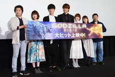 劇場アニメ「GODZILLA 星を喰う者」の公開記念舞台挨拶が、本日11月10日に東京・TOHOシネマズ新宿にて開催。ハルオ役の宮野真守、メトフィエス役の櫻井孝宏、ユウコ役の花澤香菜、マイナ役の上田麗奈、ミアナ役の小澤亜李、静野孔文監督、瀬下寛之監督が登壇した。