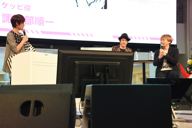 放送は2019年4月を予定しているが、すでに収録は終了しているという同作。諏訪部は「毎回どうなっていくんだろうと、台本をもらうたびにドキドキしながら収録を待っていた」と振り返る。ここで矢逆一稀役の村瀬歩、久慈悠役の内山昂輝、陣内燕太役の堀江瞬からのビデオメッセージを上映。村瀬は「幾原監督にはこだわりポイントがあって。例えば尻子玉を抜かれるときもその成分を気にされていて、『苦しい何%』『恥ずかしい何%』に加えて、『ちょっと気持ちいい』という塩梅があって、(尻子玉を抜かれる瞬間を)監督がその場で実演することもあった」と告白。「監督の話が面白かった」と話す内山に対し、現場でもよく彼が笑っていたことを村瀬が明かすと、堀江は「それまで内山さんはクールなイメージだったんですが、すごく笑う人なんだと知った」と印象を述べた。