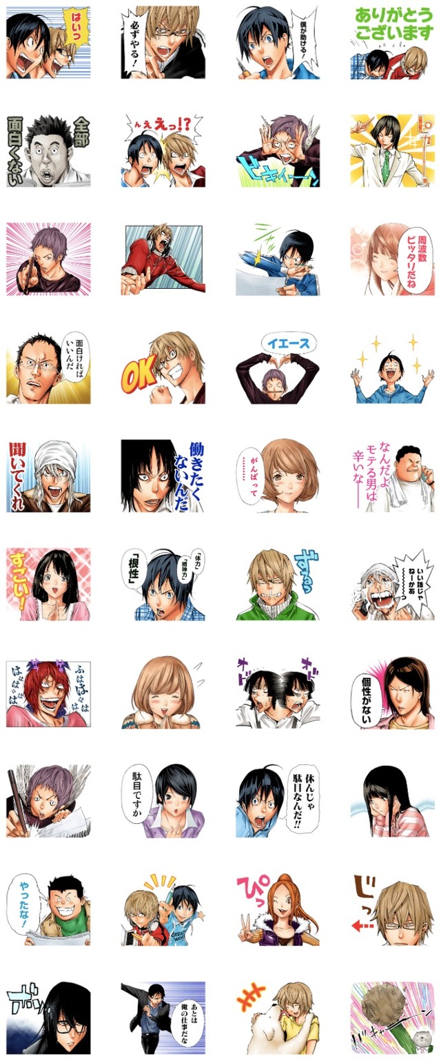 スタンプにはサイコー、シュージン、亜豆、香耶、エイジ、福田、中井、蒼樹、平丸といったキャラクターのイラストを使用。「面白ければいいんだ」と宣言する佐々木編集長や「全部面白くない」と落胆する服部など編集者たちもスタンプ化されている。購入には240円または100コインが必要。