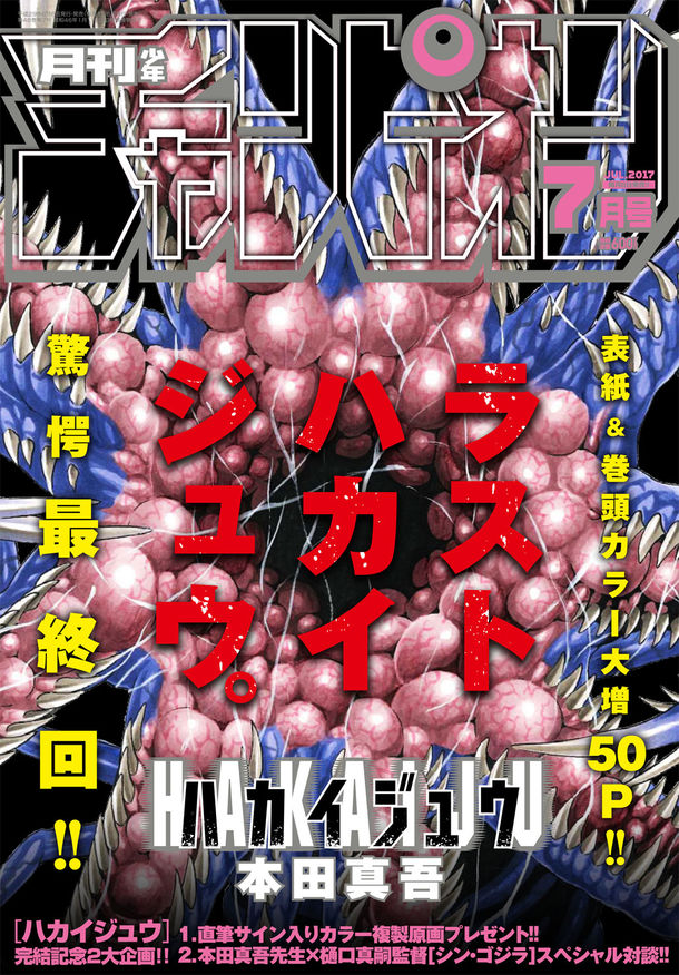 今号の月刊少年チャンピオンでは「ハカイジュウ」の完結を記念し、「シン・ゴジラ」などで知られる映画監督の樋口真嗣と、本田の対談を掲載。また1巻から21巻までの表紙イラストの複製原画プレゼントも実施されている。応募方法などは誌面で確認を。